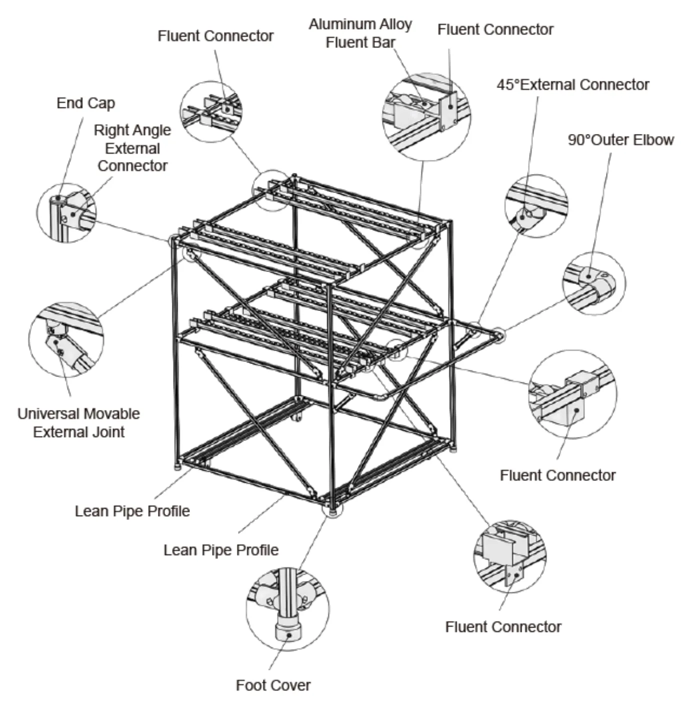 Flexible modular structures for industrial racks and workstations easy to assemble, adaptable, and durable.
